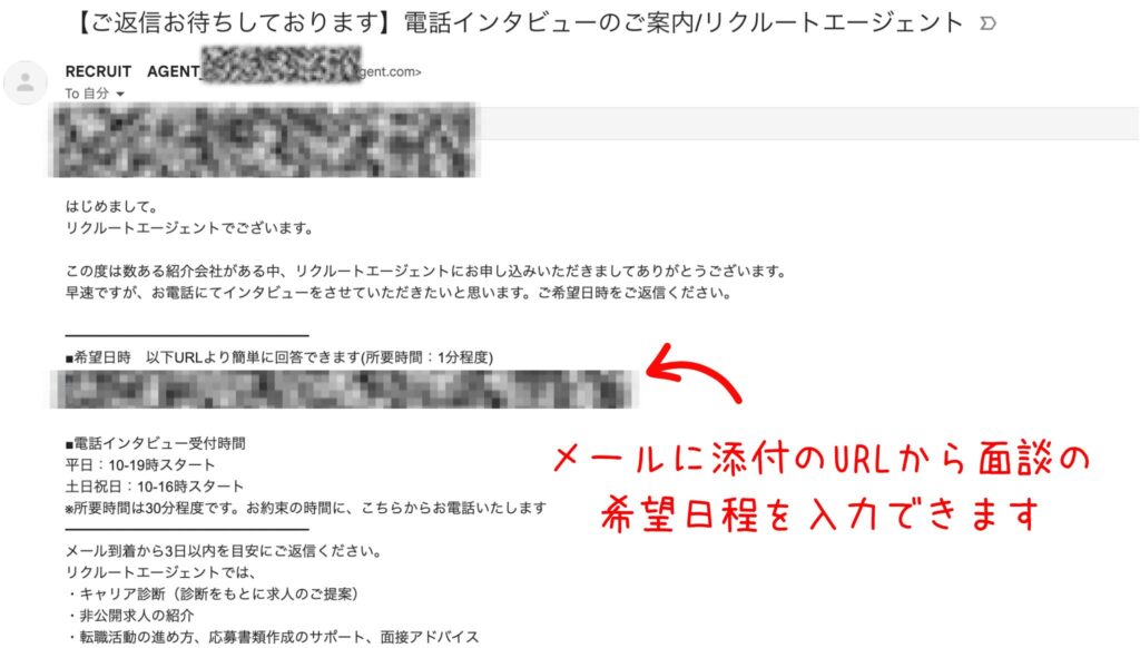 無料登録後しばらくすると、リクルートエージェントから電話面談(またはオンライン面談)の案内メールが届きます。